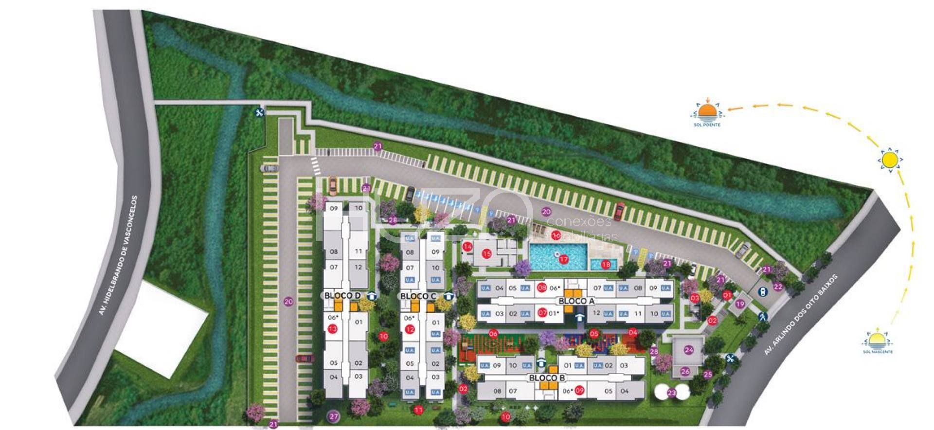 Fachada, Portaria, Piscina, Praça de chegada,
